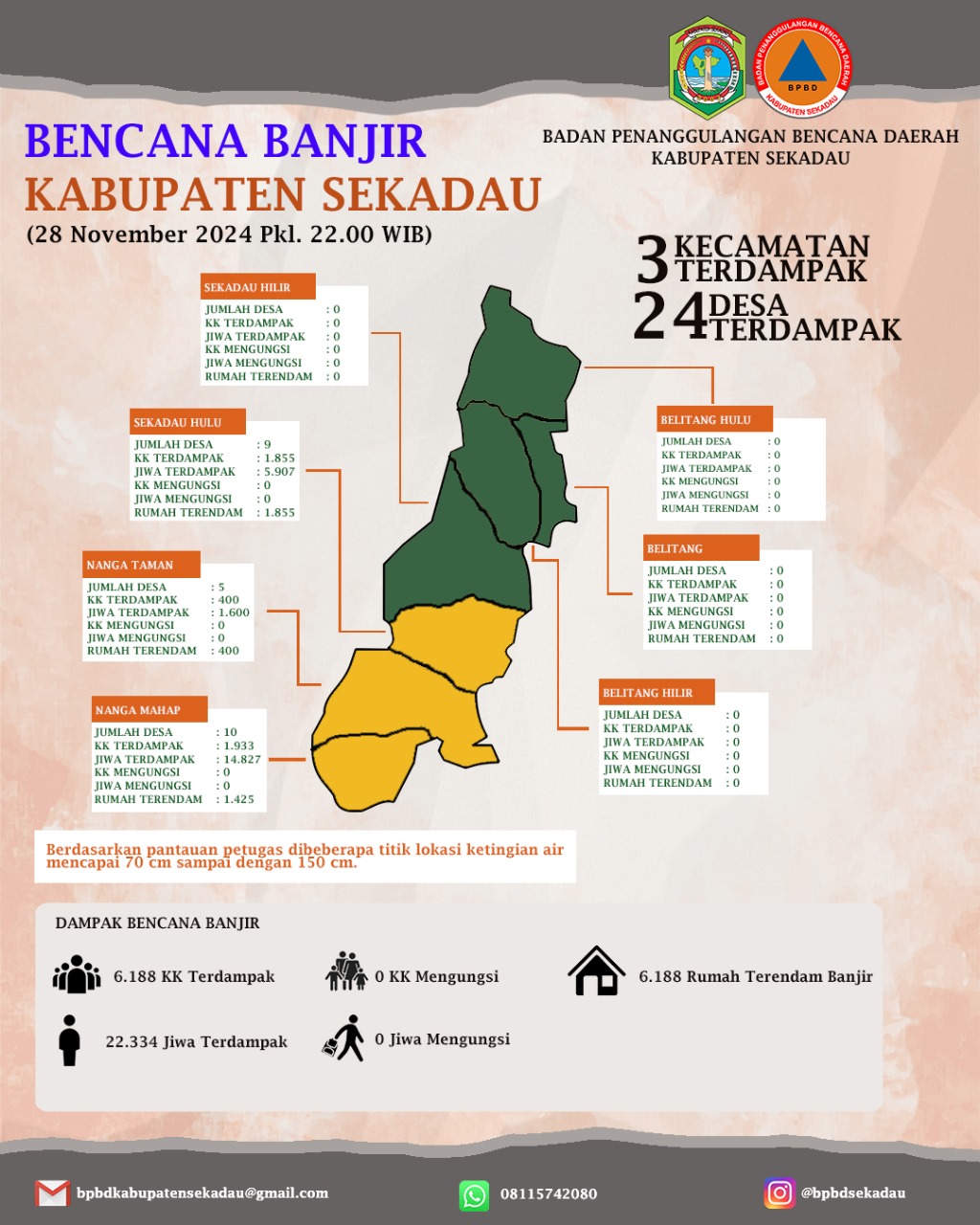 Sebanyak 6.188 rumah di 24 desa terendam banjir, dengan total 6.188 kepala keluarga (KK) dan 22.334 jiwa terdampak. Meski demikian, hingga kini tidak ada laporan warga yang harus mengungsi. Ketinggian air di sejumlah lokasi mencapai 70 hingga 150 cm.